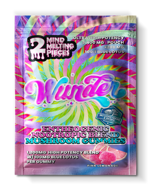 Potent. Compact. Refreshing. These Wunder High Mushroom Blend Gummies bring a bold 1,200 mg entheogenic blend per pouch in a convenient 2-piece format. Each gummy also includes 2 mg THCP, delivering enhanced effects with a tart, citrusy Pink Lemonade flavor.