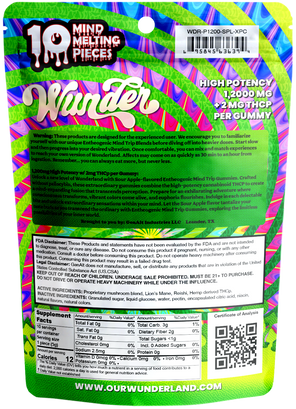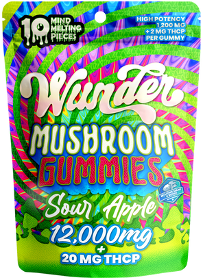 Wunder High Potency Mushroom Gummies — Sour Apple (12,000 mg blend) Dive into the crisp, tart bite of Sour Apple High Potency Gummies. Each pouch contains 10 gummies at 1,200 mg per gummy, for a...